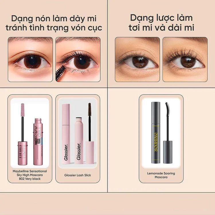 - Thường có các loại như mascara nâng mi, mascara làm dày mi.
