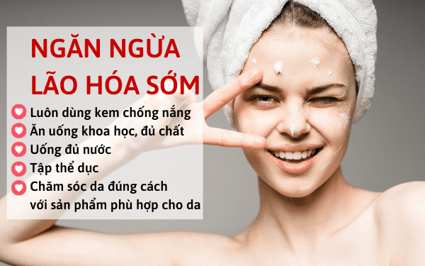 - Ngăn ngừa lão hoá da bằng cách sử dụng kem chống nắng, che chắn kỹ lưỡng khi ra ngoài trời và hạn chế thời gian tiếp xúc trực tiếp với ánh nắng vào giờ cao điểm.