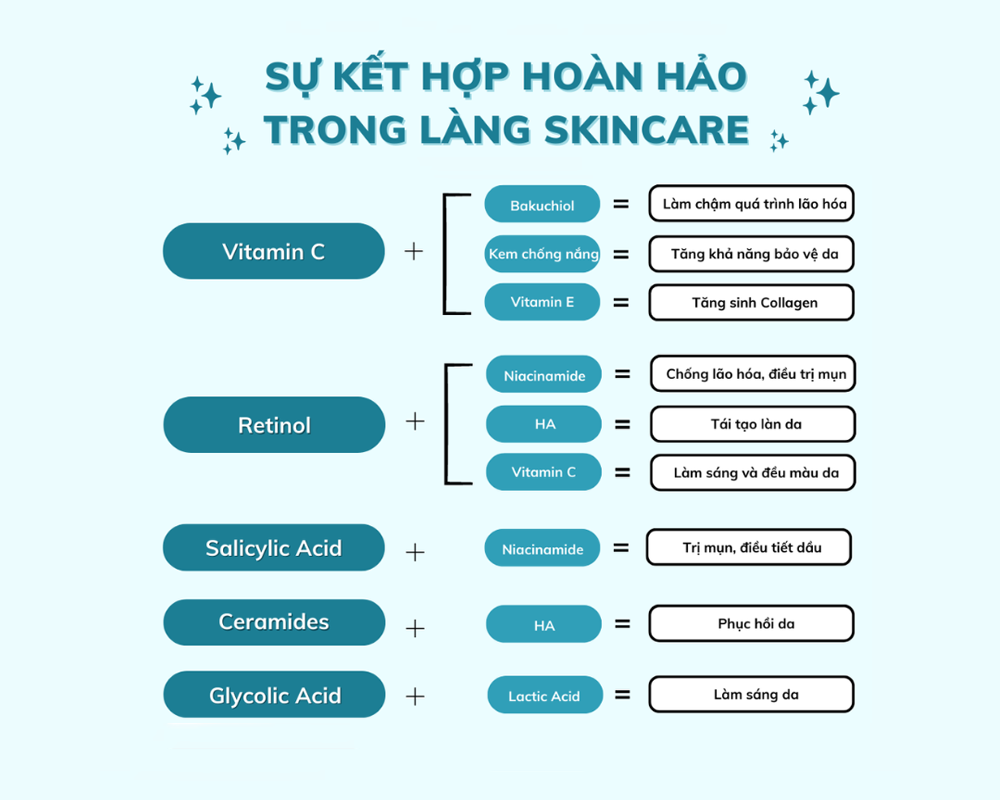 - Tối ưu hiệu quả chăm sóc da: Kết hợp các hoạt chất phù hợp sẽ nâng cao hiệu quả điều trị và duy trì làn da khỏe mạnh, trẻ trung.