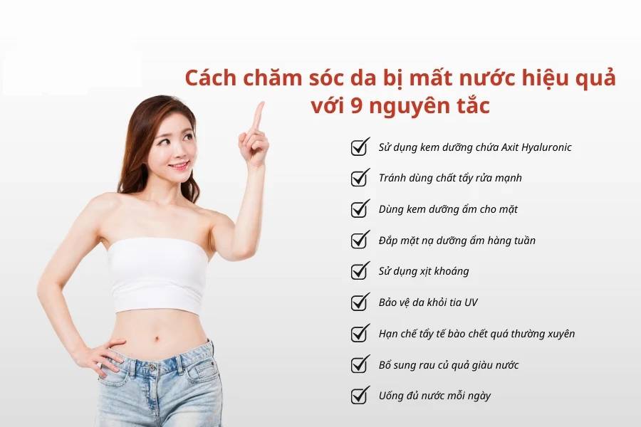 - Uống ít nhất 1,5 – 2 lít nước mỗi ngày để cung cấp đủ độ ẩm cho da.