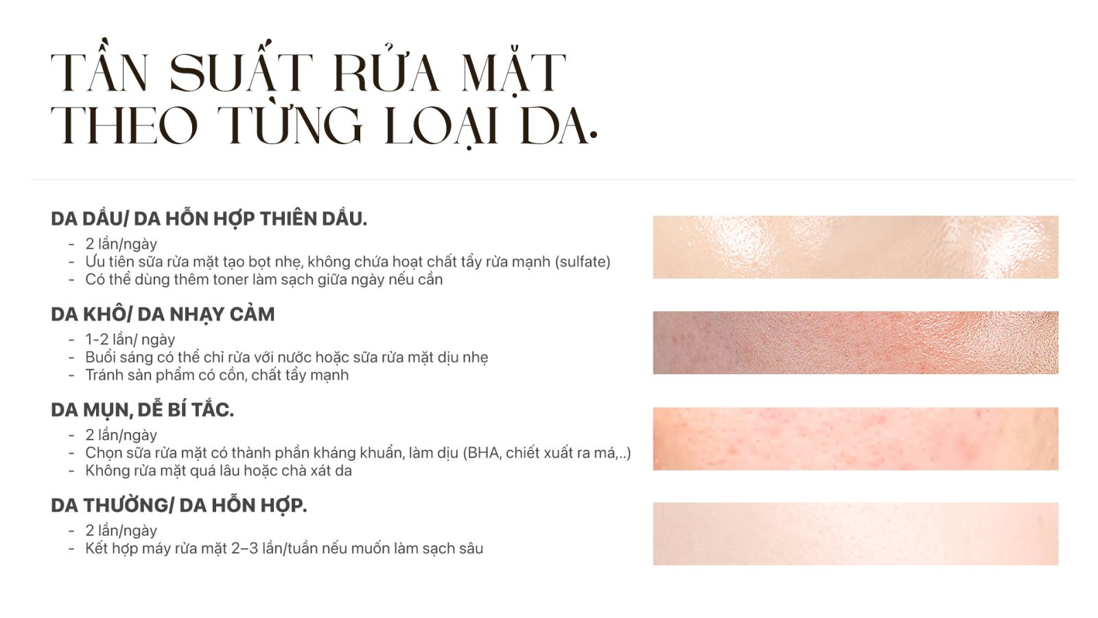 - Da khô: Chỉ nên rửa 1 lần/ngày hoặc sử dụng sữa rửa mặt nhẹ, không gây khô da.